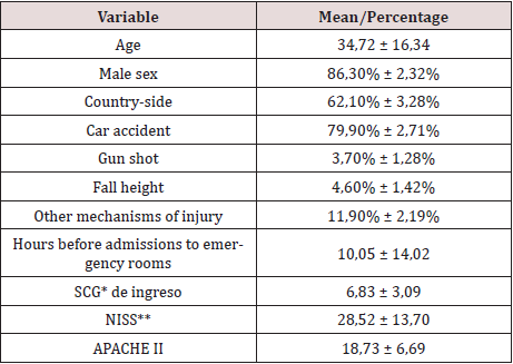 Manuel Giagni Trauma Hospital is the only public medical center specialized in trauma in Paraguay. As a result, it deals with most of the polytraumatized patients in the country. This is also noticeable because of the high number of patients they receive from the country side in despite of long distances. Therefore, the study population can be considered representative at a country level. The study population is characterized for being mostly composed of male sex and young. Traffic accidents are the main cause of injury, matching the world trend [5,15]. Age on admission is a risk factor for mortality six months after discharge, the risk is greater at older age, also described by other authors as a prognostic factor in the acute phase of trauma [1,16], as well, as a functional prognostic factor [17]. However, in our study, functional capacity is not affected by age. Probably, mortality is dependent on the patient´s biological reserve; on the other hand the neurological outcome depends on the neurological damage suffered.