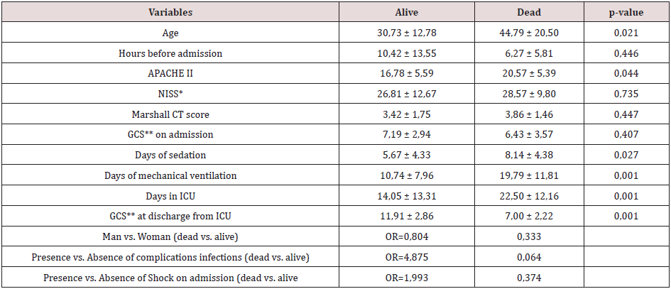 As well as with patients admitted for MoSTBI, the clinical variables between “alive and dead” during hospitalization in ICU were compared in patients contacted after six months. These clinical variables were compared to recognize the risk factors of mortality six months after discharge from ICU (Table 3). Risk factors for mortality six months after discharge from ICU were: Age upon admission (p-value 0.021), APACHE II score (p-value 0.044), days of sedation (p-value 0.027), days on mechanical ventilation (p-value 0.001), days in ICU (p-value 0.001) and Glasgow Coma Scale at discharge from ICU (p-value 0.001) (Table 3). The functional capacity six months after discharge according to the Barthel index showed that 57.60% (34 patients) reached functional independence, 5.10% (3 patients) scarce dependence, 11.90% (7 patients) moderate dependence, 13.60% (8 patients) severe dependence and 11.90% (7 patients) total dependence.