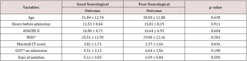 Main measures: Demographics, Glasgow Coma Scale (GCS) on admission and at ICU discharge, New Injury Severity Score, APACHE II, Marshall CT Score, mechanical ventilation, sedation, ICU length of stay, the development of shock, infectious complications were collected.