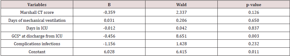 The clinical characteristics associated with a neurological outcome six months after discharge from ICU (Table 4) were: Marshall CT score (p-value 0.036), days on mechanical ventilation (p-value 0.011), days in ICU (p-value 0.016), GCS at discharge from ICU (p-value 0.001) and infectious complications (p-value 0.014). On the statistically significant risk factors for neurological outcome in the medium-term, a logistic regression analysis has been applied. As a result, the GCS at discharge from the ICU was the only variable with statistical significance to predict poor neurological prognosis (p-value 0.003) (Table 5). Therefore, it was decided to build a logistic regression model with GCS at discharge from ICU, obtaining the following mathematical model to estimate the poor neurological outcome in the medium-term.