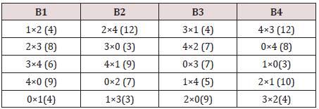 From the semi balanced array given above, we may obtain designs for Griffing’s CDC method (4) (i) by ignoring the first row and perform crosses in any two sets among the corresponding column appearing in the same two sets and developing columns mod (5) we get a mating design for diallel cross experiment OR superimposing one set to over other set. This mating design can be transformed into environmental design with parameters v =10, b =4, k =5 and r =2, by considering rows as blocks as given below.