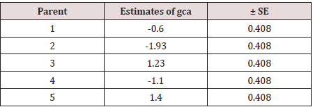 Table 4: Estimates of the general combining ability effects and their estimated error on number of tillers.