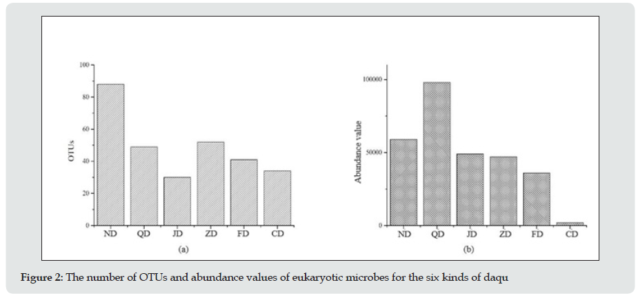 Figure 4: The number of OTUs and abundance value of prokaryotic microorganisms in the six kinds of daqu