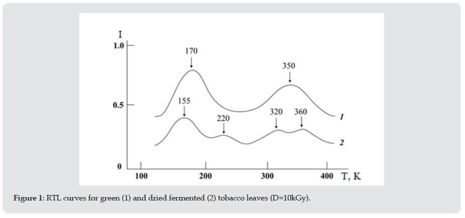 The features of radiothermoluminescence (RTL) of green tobacco leaves in a wide temperature range of 80÷450K have been studied. The luminescence curves of green tobacco leaves are characterized by the presence of maxima at temperatures of 170 and 350 K (Figure 1). After curing and fermentation of tobacco leaves, the intensity of all peaks decreases, a broad and diffuse peak (halfwidth ΔT1/2 ~ 35 K) at T = 350K split into two comparative narrow peaks with maxima at T = 320K (ΔT1/2 ~ 35 K) and T = 360K (ΔT1/2 ~ 25K) and new RTL peaks appear with a maximum at T = 220K (Figure 1). The appearance of a low-temperature peak at T = 170 K may be due to the presence of structural moisture in the tobacco composition. This is evidenced by a decrease in its intensity by ~ 2.5 times and a shift of the maximum by 15K towards lower temperatures as the degree of curing increases. Apparently, molecular water, which is in the steric environment of alkaloids, has an indirect effect on the taste of tobacco. In the literature, another works were devoted to the technical solution of this survey. According to one of them, tobacco is cooled in the geometric container to a temperature of 230 K with the container immersed in the cooling mixture (solid CO2 + acetone). However, the disadvantage of the method is that tobacco loses a significant part of its nicotine and tar during such technical processing, which the presence of these components in a certain amount is extremely necessary.