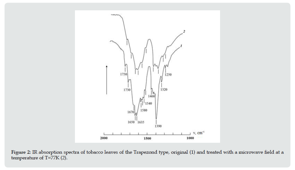 In the IR spectra, the stretching vibrations of the amino groups are at 3300 cm-1, and the bending vibrations are in the frequency range of 1590-1650 cm-1 (Figure 1). We have tried to remove bitterness and pungency by the combined action of a microwave electromagnetic field and low temperature (77K). Simultaneously, tobacco leaves cooled in liquid nitrogen were treated with a microwave field and the change in the chemical composition of tobacco leaves was traced by the IR spectroscopy of the sample. By changing the intensities of the bands associated with the breaking of branched chains, the amount of lower acids that adversely affect the quality of tobacco was determined. It should be noted that the low-temperature microwave treatment proposed by us did not lead to a significant change in the structure of various carbohydrates containing catonic and functional aldehyde groups. In addition, it is known that the quality of the finished tobacco product is strongly influenced by the curing and fermentation processes. At the same time, residual chlorophyll significantly reduces its quality. Therefore, we considered it expedient to improve the quality of the finished product by accelerating the decomposition of chlorophyll. This goal was achieved by us by searching for new methods of curing and fermentation, devoid of shortcomings that adversely affect the quality of the product. The searches have shown that one of these methods is the dielectric heating of tobacco, since mainly dielectric heating is strongly manifested on materials with low thermal conductivity and heat-resistant properties. It is clear that the impact on tobacco leaves - as a dielectric of electromagnetic fields would allow the flow of photo - and thermochemical reactions not only on the surface, but throughout the entire volume.