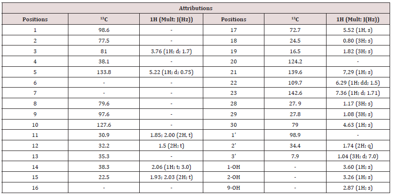 The n-hexane/ethyl 1:1 fraction A and pure acetate fraction B obtained by chromatography of the crude A. klaineanum extract was further separated by a combination of column chromatography on silica gel and preparative thin layer chromatography, resulting in the isolation and characterization of eleven compounds. On the basis of detailed spectroscopic analyses and comparison with reported data, the structures of ten of them (Figure 1) were determined as entilin B (2)[7], entilin C (2)[8], antrocarine A (4), antrocarine C (6) [5], oleanoic acid (7)[9], 7α,20(S)-dihydroxy-4,24(28)-ergostadien- 3-one (9)[10], β-sitosterolglucosid (10)[11], antrocarine F (11) [5], β-sitosterol and stigmasterol (12) [11]. Compound 1 was isolated as a white powder, which gave a positive test for limonoids with the ehrlich reagent (green) and had the molecular formula C26H34O8Na, as established by ESI-HRMS (m/z 497. 2146 [M+Na] +) regarding the ten degrees of unsaturation. The IR spectrum of 5 showed typical vibrations bands of hydroxyl group at 3499.2 and 3413.39 cm-1, at 2924.52 and 2852.00 cm-1 an elongation band of C-H bond and at 1714.41 cm-1, a large band characteristic of conjugated double bond. Analysis of the 1H-NMR data (Table 1) of compound 1, indicated resonances of aromatic protons at δH 6.29 (1H, d, J = 1.5 Hz), δH 7.29 (1H, s) and δH 7.36 (1H, d, J = 1.71) characteristic of furanic cycle β -substituted; a singlet at δH 5.52 (1H, s), two oxymetines protons at δH 5.22 (1H, d, 0.75 Hz) and δH 3.76 (1H, d, 1.7Hz), three hydroxyls protons at δH 3.60, 3.26 and 2.87, and four methyl’s groups at δH 1.81 (3H). These findings agree with the furan limonoid skeleton especially entiline’s type [7,12]. We also observed in the strong fields a methylene signal at δH 1.74 (2H, m) and an aliphatic methyl which appears in triplet at δH 1.04 ppm (3H, t).