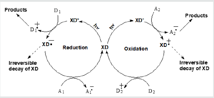 Scheme 2: Generalized presentation of a reductive and of an oxidative cycle with the participation of xanthene dyes (XD). Two circles represent two different reactions.