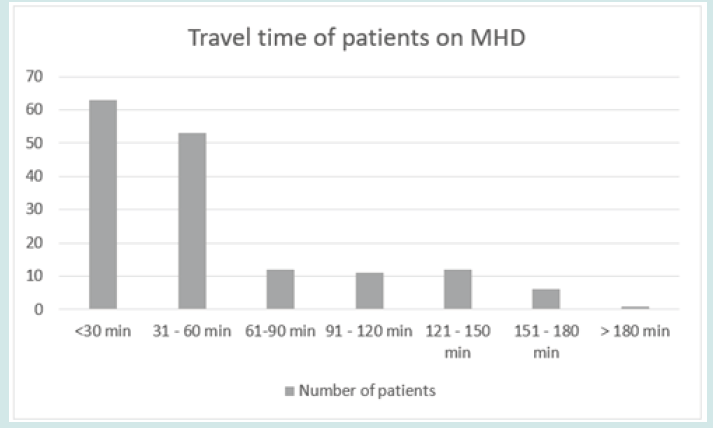 Study from both France and UK highlighted the importance of travel time to HDC [8,9]. The researchers from Australia found that geographical barriers were important in long term adherence [6]. Half of the patients required an hour travel time to HDC. The findings from United Kingdom pointed out that the adherence to treatment, hemodialysis, was inversely proportionate with travel time; they also recommended to build a new HDC if travel time was more than 45 minutes (Figures 1-3). Therefore, we need more HDC and human resources. Reallocation of man, materials and money to kidney health by modification of health policy should be done; same suggestions by other study [10]. The role of policies was the main key player in achieving equity in dialysis care and outcomes. Tackling dialysis burden around the world was a global challenge [11]. Therefore, we need more HDC and human resources. If possible, home based dialysis therapy (HBDT) should be launched. Non-medical reasons that influence PD utilization were reported as HD availability, number of HD center, distance to HDC, availability of dialysis partner, structure of dialysis program, PD experience, attitude towards home-based dialysis therapy (HBDT), and attitude towards chronic disease [12]; therefore, shared decision with the patient for choosing in-center HD or HBDT was the best option. However, the study from Switzerland showed that the majority love in-center hemodialysis.