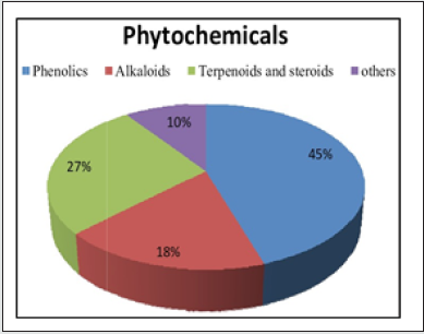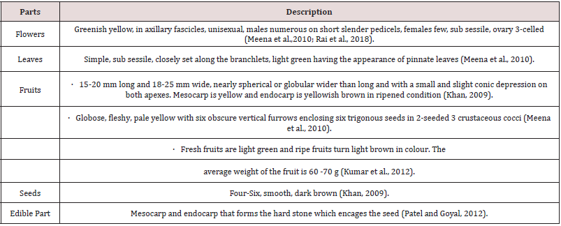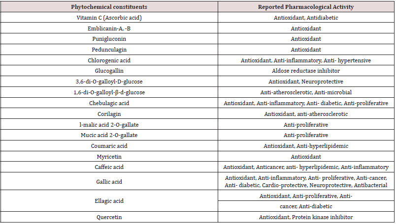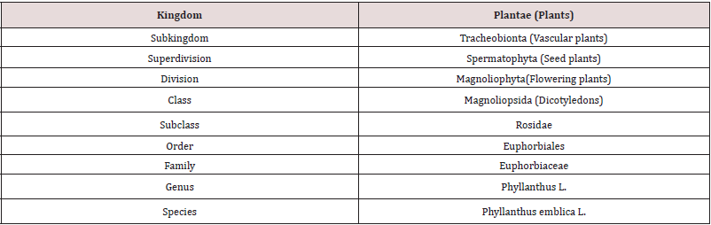 Since the beginning of human birth, man has familiarized with plants and used them as medicines, food stuffs, clothing, shelters, fertilizers, fragrances and modes of transportation throughout the ages. While searching for food and facing the human sufferings, ancient man has begun to distinguish those plants having medicinal value from others with specific pharmacological action. This interaction between plants and man has developed and many plants are being utilized for medicinal purpose Kumar et al. [1]. The starting of the development of herbal drugs is based upon the advancement of chemistry as isolation, purification and determination of plant compounds Shakya et al. [2]. Recently, in industrialized and developing countries, the assessment of safety, quality and efficiency of medicinal plants and herbal drugs has become a key concern. In recent research, it was indicated that phenolic compounds are highly present and structurally diverse phytochemical in plants as shown in classification of dietary phytochemicals Liu,[3] Figure 1. Phyllanthus emblica L. is a traditional, medicinal fruit tree which is broadly distributed in most tropical and subtropical countries particularly in central and southern India, Bangladesh, Pakistan, Sri Lanka, the Mascarene Islands, southern China and Malaysia Rai et al. [4]; Thilaga et al. [5]. This species is a medium sized fruity tree having a height of 8-18 meter with thin light grey bark exfoliating in small thin irregular flakes Meena et al. [6]. The parts of Phyllanthus emblica mostly used are flowers, dried fruits, fresh fruits, leaves and root bark Kumar et al. [7]. The flowering and fruiting session of this species are February-May and December-January Rai et al. [4]. The plant description of Phyllanthus emblica is presented in Table 1. The taxonomical classification of Phyllanthus emblica is showed in Table 2. Phyllanthus emblica L. also having some international and local common names are placed in Table 3. Figure 2 represents the plant tree and different parts of the tree. Thousand years ago, the fruits of Phyllanthus emblica with sour, sweet, bitter, cooling, rejuvenative, astringent and antipyretic characteristics were useful as traditional medicine. Moreover, Phyllanthus Emblica fruit is one of the essential and broadly used herbs in traditional medicinal system such as Ayurvedic medicine, Chinese herbal medicine and Tibetan medicine Gaire et al. [8]. Previously, most of the studies exhibited that Phyllanthus emblica had good health effects as antioxidant, anti-diabetic, anti-microbial, anti-inflammatory and hepatoprotective agent (Yang et al. [9]; Yadav et al.,[10]. The major phytochemical constituents present in Phyllanthus Emblica fruits, and their pharmacological activity is summarized in Table 4. The constituents of multiple components in Phyllanthus emblica varies based on the cultivation systems of the plant, the drying process and the harvesting period Thiangthum et al. [11]. Hence, the quality control is very crucial.