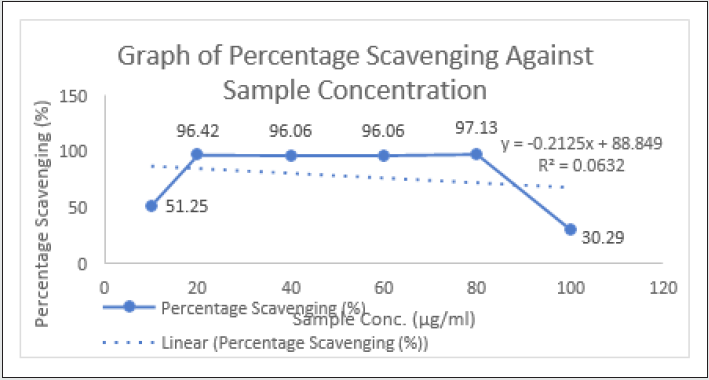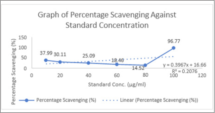 0.2ml of Folin-Ciocalteu reagent, 4ml of 2.5% sodium carbonate and 0.2ml of ethanol were added into the test tube and it was allowed to stand for 2 hours. [22] The absorbance of the standard solution was examined by 750nm UV spectrophotometry. The values of absorbance of standard and sample obtained were then utilised in plotting the graph of UV absorbance against the concentration of sample and standard.