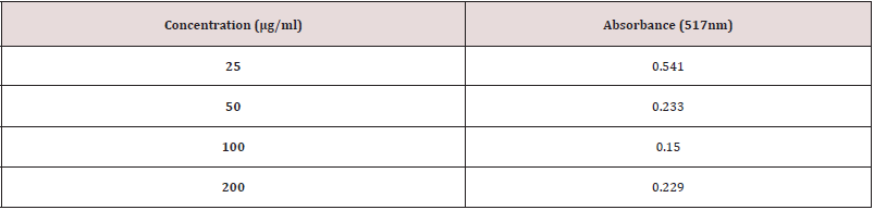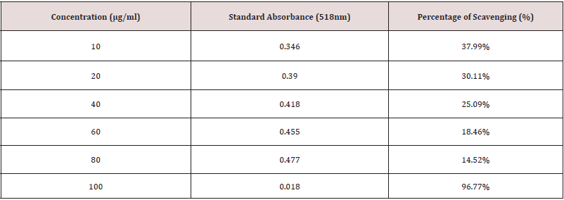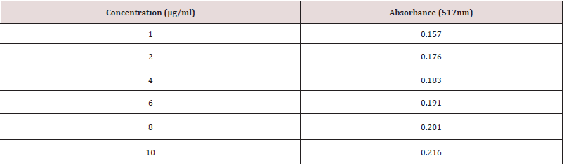 BHT was used as a standard in this assay. 6 different concentrations of BHT solutions were prepared at 10, 20, 40, 60, 80 and 100μg/ml. The stock solution was first prepared by dissolving 10mg of BHT in 10ml of methanol. 1ml of the solution was then diluted ten-fold with 9ml of methanol to obtain a concentration of 100μg/ml. From the stock solution, 10, 8, 6, 4, 2, 1ml were [23,24] pipetted into 6 different test tubes and made up to 10ml with methanol. Then, 3ml of 0.1mM DPPH reagent was added to 2.5ml of different concentrations of methanolic extracts. The mixtures were shaken and labelled accordingly. The test tubes were allowed to keep in the dark for 30 minutes. The absorbance was measured at 518nm using a UV spectrophotometer.