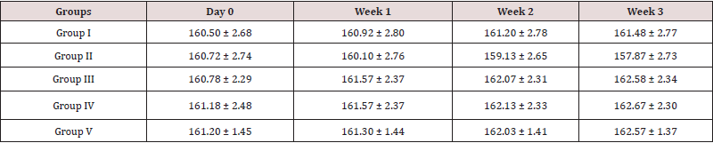 Table 9: Effects of ethanolic extract of Phyllanthus emblica fruits on body weight (g) of Sprague-Dawley rats, Values are expressed as mean ± standard error of the mean (n= 6).