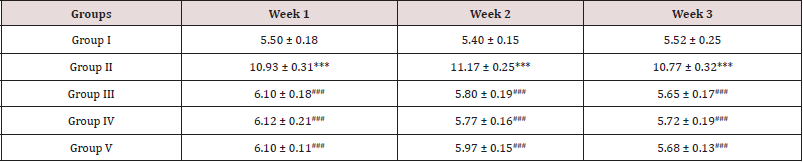 All the data was expressed as mean ± standard error of the mean (SEM) and evaluated by one-way analysis of variance (ANOVA), followed by Tukey’s post-hoc test. P < 0.05 will be considered as [31,32] statistically significant. Anti-hyperglycaemic activity of ethanolic maceration fruit extract was screened in vivo in alloxan monohydrate induced diabetic rats. Alloxan acts as a beta cytotoxin is generally used to induce experimental diabetes through destroying the insulin secreting pancreatic β-cell by the production of ROS, resulting in a depletion of endogenous insulin release (Chackrewarthy, 2012). The diabetic rats were given fruit extract at two different doses, 200 mg/kg/P.O. and 400 mg/kg/P.O. once daily for 21 consecutive days and the blood glucose level was monitored on 7th, 14th and 21st days of the experiment. The effectiveness of antihyperglycaemic activity of phyllanthus emblicais extract was compared with the standard drug, glibenclamide. Glibenclamide is a sulphonyl urea oral hypoglycemic agent that exerts its antidiabetic action by early extra-pancreatic and late insulin stimulation.