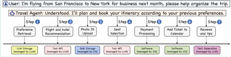 During the plan execution, agents show the reasoning and decision-making abilities, which sets it apart from the traditional software applications that are constrained to a pre-defined set of functions or workflow [20]. To realize this travel scenario, the agent needs to interact with both LLM services (e.g, retrieving and understanding user preferences, deciding which tool API to call, generating reviews and responses) and traditional operating system (OS) services (e.g., accessing disk driver and executing software).