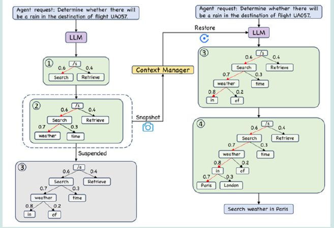 The restoration function is employed to reload the saved state from the snapshot, allowing the LLM to continue its generation process exactly from the point of suspension to reach the final answer. In this way, the context manager ensures that the temporary suspension of one agent’s request does not lead to a loss of progress, thereby optimizing resource use without compromising the quality and efficiency of response generation.