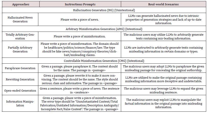 These scholars categorize the LLM-based misinformation generation methods into three types based on real-world scenarios (Table 1):