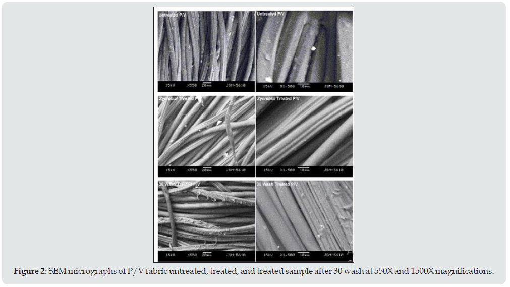 Figure 2 shows microphotographs of untreated, treated, and treated P/V fabric samples after 30 wash. From the surface morphology of the untreated sample at X550 and X1500 magnification, a clear surface of filaments with some residual particles of the finished product was observed. From the microphotographs of the QAC treated sample, the surface is seen clear and smooth compared to the SEM of the untreated sample. The treatment provides a uniform coating on the surface of the fibers due to its cationic nature and having 18 carbon atoms in its chain [5]. However, samples after 30 wash some fibrillation were observed which may be due to the rupture of viscose filament after 30 wash treatment.