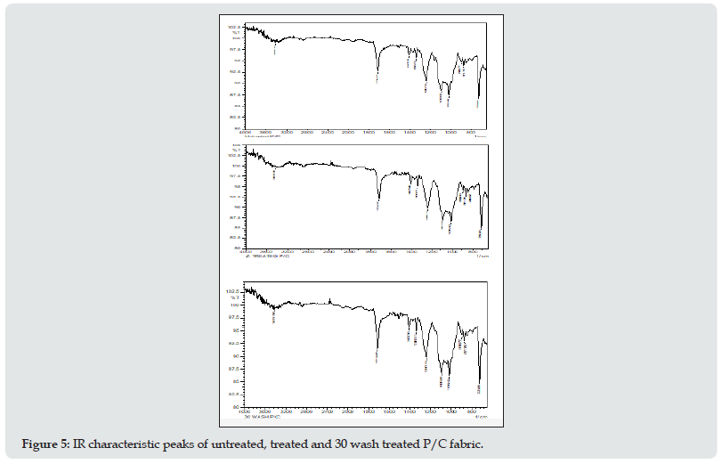 The FT-IR spectra and absorption peaks for P/V fabric with and without antimicrobial treatment along with spectra of the treated samples after 30 wash are shown in Figure 4. From the results, the presence of silane bonded with –OH group of fabric by Si-O-Si continuous linkage was characterized at around 800 &1086 cm-1, which are attributed to Si-O bending vibration band and Si-O-Si antisymmetric stretching vibration band respectively. The peaks in the FT-IR spectra of p/v blend fibers appeared in the range of 600-4000 cm-1 (Figure4). The waves were assigned as follows: 1714 cm-1 (C=O), 1407 cm-1 (aromatic ring), 1338 and 1016 (carboxylic ester or anhydride), 1095 cm-1 and 1016 cm-1 (O=C–O–C or secondary alcohol), 971 cm-1 (C=C), 871 cm-1 (five substituted H in benzene), 844 cm-1 (two neighboring H in benzene), 723 cm-1 (heterocyclic aromatic ring). The main structure of the polyester sample had ester, alcohol, anhydride, aromatic ring, and heterocyclic aromatic rings. Alcohol was able to react with anhydride and produce ester groups. That was the reason there was still alcohol and anhydride as residual reactants left in the polyester. The carboxyl, ester, anhydride, and alcohol groups showed the polyester fabric was not pure PET. The peak at 1407 cm-1 corresponded to the aromatic ring which was a stable group. It was the characteristic absorption peak of PET. Polyester/cotton blended fabric used for the experiments contains polyester (67%) as a major component. Therefore, the peaks appearing in the 723 cm-1 can be attributed to the polyester component of the blend. The peak at 1712 cm-1 can be assigned to the stretching vibration of the C=O group in ester. The peaks at 1240 cm-1 and 723 cm-1 can be assigned to asymmetric C=O stretching vibration and aromatic C-H out-of-plane vibrations respectively. A weak peak observed around 896 cm-1 is attributed to the stretching of the C-N (+) bond formed in the treated fabric.