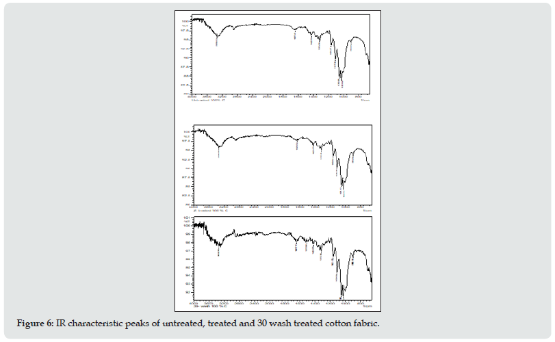 The intramolecular changes of the cotton fabrics before and after QAC treatment also after 30 wash are characterized by FT-IR spectral analysis, shown in Figures 6 The absorption in the region of 3600-3100 cm-1 was due to the stretching of –OH groups [6-8] and at 3000-2800 cm-1 to the CH stretching, the slight increase of these contents after the treatment may indicate that hydrogen bonds and methyl and methylene of cellulose had some additional attachment [8-11]. The band at 1635 cm-1 arose from the H–O–H bending of the absorbed water. The symmetric –C–H bending occurred at 1423 cm-1. The band at 1372 cm-1 was assigned to –OH bending and at 1315 cm-1 to C–C and C–O skeletal vibrations. While the bands at 1051 and 1029 cm-1 indicated C–O stretching at C3, C–O stretches at C6 and C–C stretching [12-15]. These C–O stretching bands gave slight shoulders at 1161 cm-1 which represented the antisymmetric bridge stretching of C–O–C groups in cellulose. The band at 1107 cm-1 corresponded to asymmetric glucose ring stretching. After the treatment, the bands at 1161 cm-1 decreased slightly and 1107 cm-1 increased slightly.