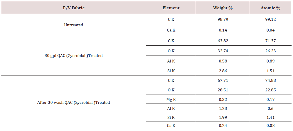 The elemental analysis of P/V samples with and without QAC treatment was recorded using Oxford-Inca software on a scanning electron microscope. From Figure 3 various peaks for carbon, calcium, iron, etc. were observed in the case of untreated P/V fabric. Fabric sample with the treatment and treated sample after 30 wash show peaks for Si as element indicates the presence of silane in treated sample. The present higher quantity of oxygen in the treated sample as seen from Table 2 indicates that the silane is in the form of oxide or dioxide. The presence of a peak for Si in the treated sample indicates that the silane remains in the fabric even after 30 wash. Various peaks for carbon, Ca, Al, etc. have also appeared in Figure 3. This may be due to the use of carbon-coated aluminum sheets as a sample holder.