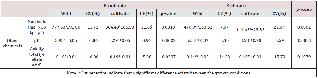 Determined in this study are nitrates, pH and total acidity and their content is shown in Table 3. Nitrates and pH showed significant differences (p<0.05) between growth systems, both in the species P. ruderale and in the species P. oleracea. On the contrary, total acidity did not present significant differences between plants growth systems. As there is a natural nitrogen cycle in plants, it can be modified by applied agronomic practices and climatic conditions, as well as by storage conditions during post-harvest. The toxicity of nitrates increases when reduced to nitrites. However, the WHO/ FAO indicates that the acceptable daily intake of nitrates expressed as ions is 3.7 mg NO3-·kg-1 of body weight. Hence the importance of determining the amount of nitrates in edible plants. All these chemicals interfere with the organoleptic qualities of the species and are considered the internal quality parameters of vegetables in the agri-food industry [48-53].
