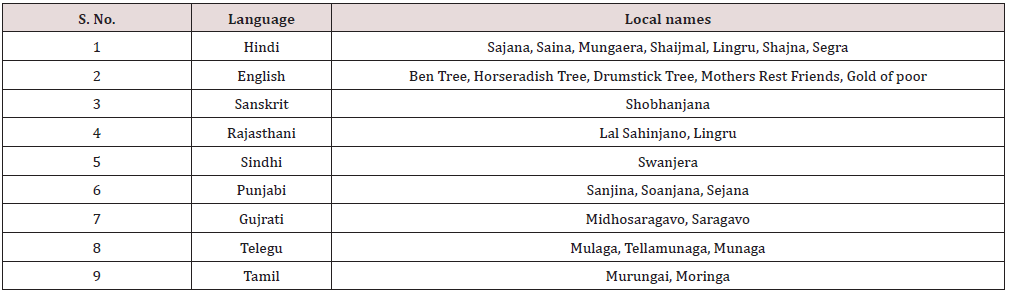 The immature fruits of moringa are also used in several culinary dishes either strapping of tough skin or with the skin intact. Tender fruits are also used in samber. Seeds are eaten green or roasted and used in tea and curries [11]. Fried seed tastes like peanuts. Moringa seed produces valuable oil (yield 30-40% by weight) known as “oil of Ben” which is a sweet, non-sticking, non-drying, light brown to semi-transparent oil that resists rancidity. The oil is known as the most stable natural oil which is a good source of Behenic acid in nature and used as a preservative in food industries and an additive in perfumery and hair care products [12]. Moringa tree has good adaptability to weather, soil and other environmental conditions so it is also known as “Never Die plant” [13]. It is a good erosion controller, soil improver, ornamental tree, boundary/ barrier/support providing plant, a good intercrop and pollution controller [14]. India is major exporters of moringa products to the agricultural, pharmaceutical, cosmetics and food industries for over a decade. A number of value-added products like fresh fruits, moringa pickle, dehydrated moringa, moringa oil, moringa seed, moringa leaf powder, moringa cake powder, moringa root, moringa soup powder, moringa juice powder and moringa capsule etc. are prepared for domestic purpose as well as for export. Thus, Moringa plant has multipurpose uses and therefore, called as “Miracle tree” [15,16]. It is also known as “drumsticks”, “mother’s milk”, ‘’cabbage tree”, “horseradish tree”, ‘’mother’s best friend tree” and many other names (Table 1). The tree is under explored and need attention to grow, particularly in dry area where climatic conditions are harsh, and soils are not productive for other crops.