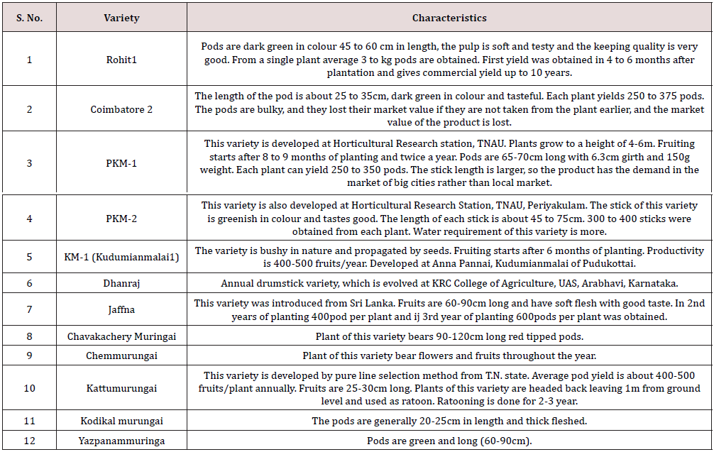 Agriculture universities and ICAR institutes have developed morngia varieties suitable for different areas of India. Some of them are Rohit1, Coimbatore 2, PKM-1, PKM-2, KM-1 (Kudumianmalai1), Dhanraj, Jaffna, Chavakachery Muringai, Chemmurungai, Kattumurungai, Kodikalmurungai, Yazpanammuringa, KonkanRuchira etc (Table 3).