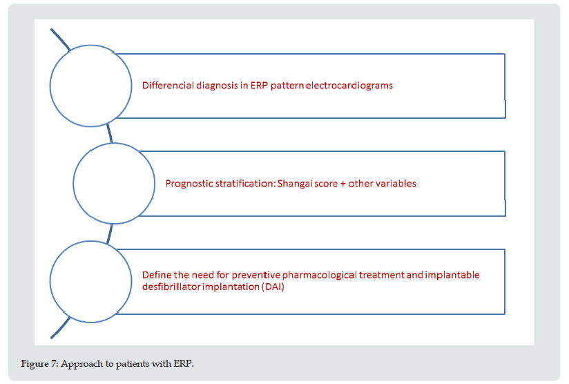 Undoubtedly, there is sufficient evidence to link the presence of ERP with an arrhythmogenic substrate, independently of the underlying pathophysiology [46]. Through evaluation based on the Shanghai score and other prognostic variables, allows us, through our interpretation, to classify patients into groups using the following approach (Figure 6). The starting point in the diagnosis of the ERP pattern is the differential diagnosis of entities that present with ST-segment elevation, such as ischemic heart disease, pericardial syndromes and BrS [47-49]. Secondly, there is the classification as ERS using the Shanghai score, with the intention of identifying its prognostic stratification. Finally, the need for preventive pharmacological treatment and implantation of a subcutaneous holter and clinical follow-up or cardio defibrillator (ICD) is assessed. There are no reports regarding the usefulness of other techniques, such as radiofrequency ablation (Figure 7).