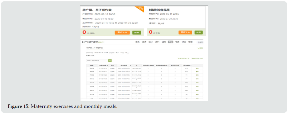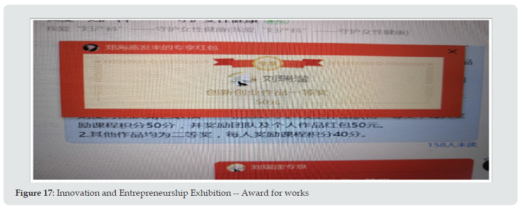 In order to cultivate students’ innovative thinking, this course also takes innovation and entrepreneurship training as its teaching feature, and students complete maternity exercises, monthly meal and innovation and entrepreneurship works. In the second semester 2019-2020 academic year, because of the influence of the outbreak, the students can’t back to school, considering family environment can provide conditions and time to finish this work, the first line at the beginning of the term class homework to the student, request to individual units of each completed a maternal fuck or confined meal (Figure 15), to upload assignments in the form of video and document study, It is required to be completed before the resumption of school, and the scores will be automatically counted into the students’ daily scores according to the proportion of the curriculum. It can not only cultivate students’ innovative thinking, closely connect theoretical knowledge with clinical practice and life, improve students’ interest in learning, but also exercise students’ life skills. Resumption after schooling may also gave the students a creative work (Figure 16), asked the students in different forms, such as calligraphy and painting, poetry, music, dance, letters, rap, sitcoms, debates, etc., showed the learned knowledge through the work of obstetrics and gynecology, voluntary, but teachers need to explain to the students to participate in the student to carry on the appraisal, a total of four class review two grand prize, In other words, those whose works get full marks will be rewarded with a red envelope of 50 yuan (Figure 17), plus 50 points for the course points, and 10~50 points for other awards according to the quality of their works. Student participation rate is high (60%), which greatly improves teaching and learning results. In the second semester of 2020-2021, in order to facilitate students to finish their homework, teachers will assign homework in advance during the holidays. Students can use the holidays to finish the homework. In other words, they can participate in the housework and taste the fruits of their labor with their families.