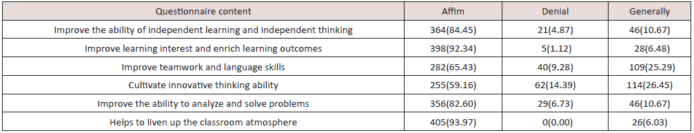 Table 1: Effect evaluation of “Internet + Learning Pass” blended teaching by 431 students [N (%), people].