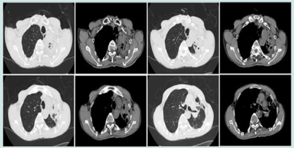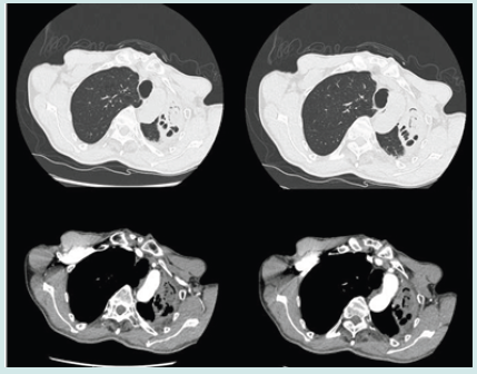 Figure 2: After 1 month of oral voriconazole, preoperative CT examination showing left upper lobe bronchiectasis with obstructive atelectasis and inflammation. The upper left pleura was thickened.