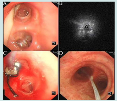 Figure 3: 3A. Preoperative tracheoscopic image showed a large purulent secretion. 3B. R-EBUS localization image. 3C. Tracheoscopic image during catheterization. 3D. Tracheoscopic image 5 days after catheterization (carina) showed a fewer granulation tissues.