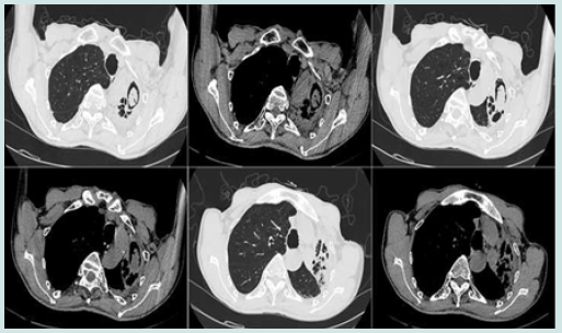 Figure 1: Chest CT showed bronchial dilatation and chronic inflammation in the anterior and posterior segments of the upper lobe of the left lung, with destruction of the left lung. Fibreoptic bronchoscopy showed a patent, twisted left main bronchus with congested mucosa. A large amount of purulent secretions was seen in the right branch of the left upper lobe.