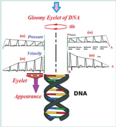 The rotating mode shapes will be induced on the forced vortex region (Rigid Zone) of Rankine model. While the speed of vortex region will be increased, the pressure of fluid starts to drop. Resonance can cause to occur the rapid pressure drop (axial acceleration) along with angular acceleration. It is predicated to appear Gloomy Eyelet into mediums as left Ventricular and DNA with assumed rotating frequency (ω). The beat pressure (standing wave) with the assumed frequency (Ω) can be generated by the pressure wave of blood on the blood vessel and reflecting wave of blood pressure on the blood vessel. The beat frequency of pressure vessel is anticipated around 1 Hz to 1.3 Hz. A spring pendulum (also called elastic pendulum or swinging spring) is a physical system which it can appear Gloomy Eyelet (GE). DNA with doubles helix can act as two swinging spring at the specific frequency of swinging motion (Figure 1).