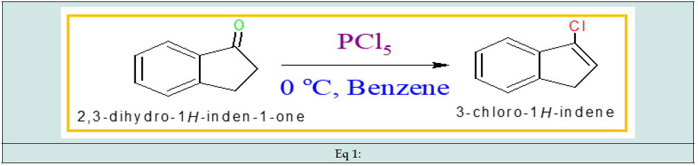 Synthesis of tetrahydro-dibenzo[a,d] [7]annulene- 5,11-disemicarbazone: Phosphorus pentachloride dissolved in benzene that solution added into 2,3-dihydro-1H-indene- 1-one at 0oC temperature to yield 3-chloro-1-H-indene. (Eq 1 Potassium t-butaoxide mixed into 3-Chloro-1H-indene solution at 0oC temperature to give 2,3-cyclohexane-indene. (Eq 2)