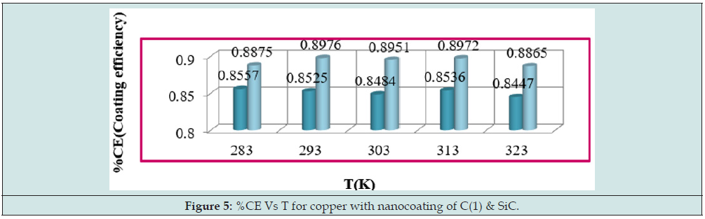 The surface coverage area developed by tetrahydro-dibenzo[ a,d] [7]annulene-5,11-disemicarbazone and SiC to calculate by equation ɵ = (Ko-Ko/K) at 283, 293, 303, 313 and 323K temperatures and their values were recorded in Table 1. It noticed that nanocoating tetrahydro-dibenzo[a,d] [7]annulene-5,11-disemicarbazone occupied lesser surface with respect of SiC . It clearly noticed in Figure 4 plotted between ɵ (surface area) versus T (temperature). The percentage coating efficiency of tetrahydro-dibenzo[a,d] [7]annulene-5,11-disemicarbazone and SiC were determined by equation CE = (Ko-Ko/K)X 100 at 283, 293, 303, 313 and 323K temperatures and their values were given in Table 1. (Figure 5) depicted SiC produced higher coating efficiencies with respect of tetrahydro- dibenzo[a,d] [7]annulene-5,11-disemicarbazone as shown in graph % CE (percentage coating efficiency) versus T (temperature).