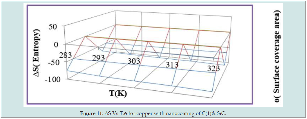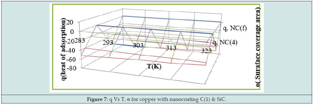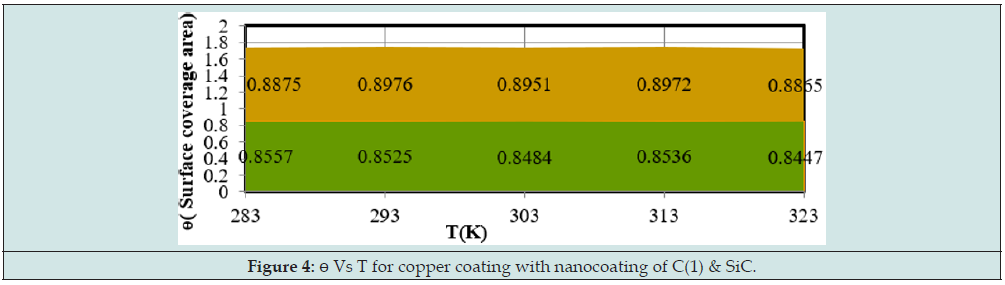 Arrhenius equation d/dt(logK) = A e-Ea/RT used and Figure 2 for calculation of activation energy of uncoated and coated copper with tetrahydro-dibenzo[a,d] [7]annulene-5,11-disemicatbazone and SiC and their values were written Table 2. Activation energy found to be higher with uncoated copper, but their values reduced with nanocoating and electrospraying compounds. Activation energies values indicated nanocoating and electrospray compounds formed chemical bond with copper metal. The activation energy results of Table 2 indicated that activation energy nanocoating and electrospray reduced, and surface coverage area increased as shown Figure 6. Heat of adsorption determined by Langmuir isotherm log (θ/ 1-θ) = log (A .C) - (q/ 2.303 R T) for copper coating of tetrahydro- dibenzo[a,d] [7]annulene-5,11-disemicarbazone and SiC at 283, 293, 303, 313 and 323 K temperatures. Heat of adsorption recorded in Table 2, and its values were show that heat of adsorption reduced and surface coverage increased as shown in Figure 7 which plotted q(heat of adsorption) versus T(temperature) and ɵ(surface coverage area). The negative values of heat of adsorption indicated that nanocoating and electrospray compound bonded with copper metal by chemical bonding. Heat of adsorption determined by Langmuir isotherm log (θ/ 1-θ) = log (A .C) - (q/ 2.303 R T) for copper coating of tetrahydro-dibenzo[a,d] [7]annulene-5,11-disemicarbazone and SiC at 283, 293, 303, 313 and 323 K temperatures. Heat of adsorption recorded in Table 2 and its values were show that heat of adsorption reduced and surface coverage increased as shown in Figure 7 which plotted q(heat of adsorption) versus T(- temperature) and ɵ(surface coverage area).