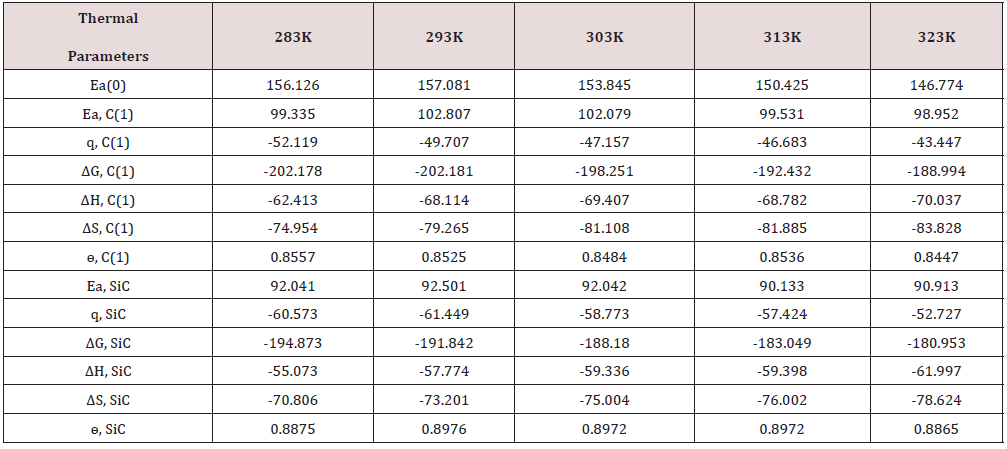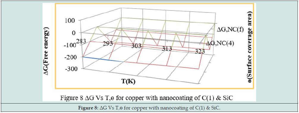 The negative values of heat of adsorption indicated that nanocoating and electrospray compound bonded with copper metal by chemical bonding. Free energy of tetrahydro-dibenzo[a,d] [7]annulene- 5,11-disemicarbazone and SiC obtained by equation ΔG = -2.303 RT log(33.3K) and their values were given in Table 2. The results of Table2 exhibited that nanocoating and electrospray formed composite barrier by chemical bonding. Figure 8 depicted that free energy decreased as temperatures rising whereas surface coverage area enhanced such results observed in Figure 8. Exothermic process occurred during nanocoating and electrospraying of tetrahydro- dibenzo[a,d] [7]annulene-5,11-disemicarbazone and SiC.