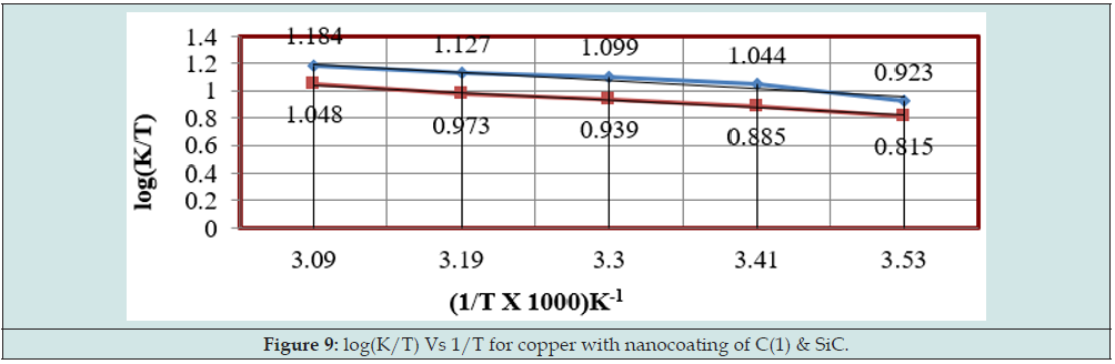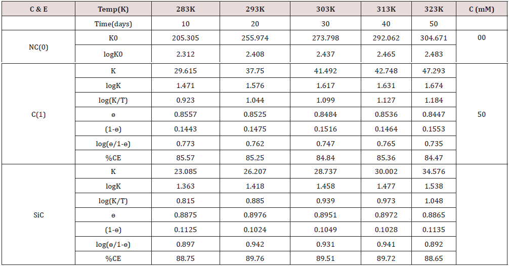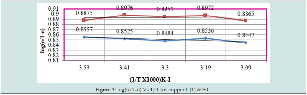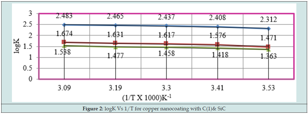 The results of Table 1 were shown that uncoated copper increased as immersion time enhanced but these reduced with coating and electrospray compounds. Such trends clearly noticed in Figure1 which plotted between K (corrosion rate) versus t (day). C(o) = Uncoated C(1) = tetrahydro-dibenzo[a,d] [7]annulene- 5,11-disemicarbazone] The corrosion rate of uncoated and coated copper was calculated at 283, 293, 303, 313 and 323K temperatures and their values were mentioned in Table 1. The uncoated copper metal corrosion rate found to be high but its values reduced coating with tetrahydro-dibenzo[a,d] [7]annulene-5,11-disemicarbazone and SiC. The corrosion rate of uncoated and coated copper variation with temperatures mentioned Table 1. It observed that tetrahydro-dibenzo[a,d] [7]annulene-5,11-disemicarbazone and SiC decreased corrosion rate as temperature rising 283 to 323 K. Figure2 plotted between logK versus 1/T found to be straight and this graph satisfied Arrhenius equation. Copper coated with tetrahydro-dibenzo[a,d] [7]annulene-5,11-disemicarbazone and SiC at 283, 293, 303, 313 and 323K temperatures and the values log(ɵ/1-ɵ) obtained by Figure 3 which plotted between log(ɵ/1-ɵ) versus 1/T. The results of log(ɵ/1-ɵ) with nanocoating and electrospray were given in Table1. The values of log(ɵ/1-ɵ) decreased with tetrahydro-dibenzo[a,d] [7]annulene-5,11-disemicarbazone but its values enhanced with SiC.