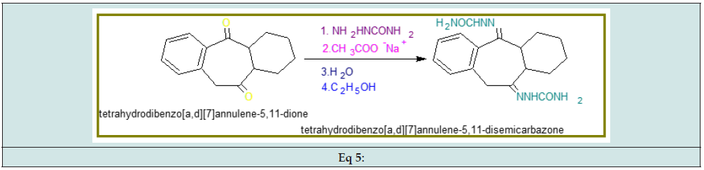 The solution semicarbazide added into tetrahydro-dibenzo[ a,d] [7]annulene-5,11-dione in presence of sodium acetate, HCl and ethyl alcohol to reflux the reaction mixture for 1hour to yield tetrahydro-dibenzo[a,d] [7]annulene-5,11-disemicarbazone. (Eq 5).