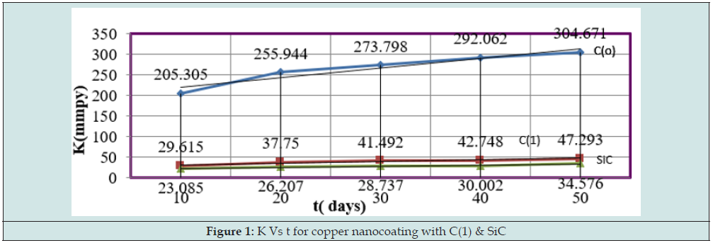 The corrosion rate of metal was calculated by equation K = 13.56 W/D A t, (where w is weight loss, D is density, A is surface area and t is immersion time). The copper metal was coated with tetrahydro-dibenzo[a,d] [7]annulene-5,11-disemicarbazone and SiC and its corrosion at different interval of 10, 20,30,40 and 50 days recorded in Table 1.