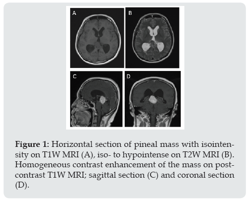 Figure 1: Horizontal section of pineal mass with isointensity on T1W MRI (A), iso- to hypointense on T2W MRI (B). Homogeneous contrast enhancement of the mass on postcontrast T1W MRI; sagittal section (C) and coronal section (D).