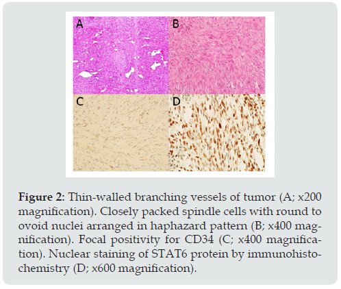Figure 2: Thin-walled branching vessels of tumor (A; x200 magnification). Closely packed spindle cells with round to ovoid nuclei arranged in haphazard pattern (B; x400 magnification). Focal positivity for CD34 (C; x400 magnification). Nuclear staining of STAT6 protein by immunohistochemistry (D; x600 magnification).