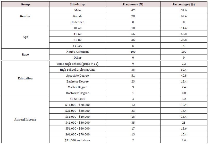 As displayed in (Table 1), the following sociodemographic characteristics of the sample include: 1) gender, 2) age, 3) race, 4) education, and 5) annual income. The study included 125 adult Native American participants with a mean age of 54.8 years The age reported was predominantly in the 41–60 category (52.8%), followed by the 61–80 group (28.8%), the 18-40 group (14.4%), and the 81- 100 (4.0%). The sample of participants who completed the survey was predominantly female (62.4%). Most of the sample (40.8%) earned an associate degree or higher with an annual income of $41,000- $50,000 (28%).