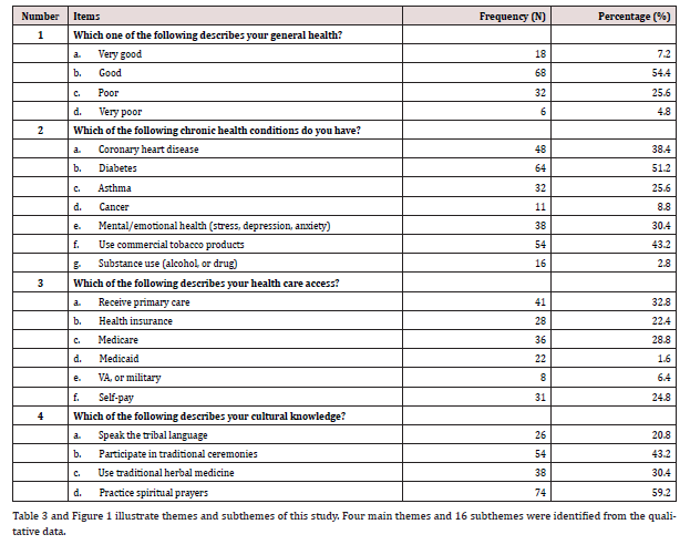 A total of 125 questionnaires were collected. No missing data was recorded. (Table 2) shows the results of the health survey questions regarding health experiences related to perceived general health, chronic health conditions, health care access, and cultural knowledge. Almost half of the participants (54.4%) responded that their perceptions about general health are good. Also, 25.6% indicated poor and 4.8% indicated their perceptions about their general health as being very poor. Participants (51.2%) identified diabetes as their predominant chronic health condition followed by use of commercial tobacco (coronary heart disease (43.2%). Availability of primary care was indicated by 32.8% of the participants along with 22.4% of the participants indicating they currently have health insurance. Other types of health care coverage include Medicare (28.8%), Medicaid (1.6%), and military or veterans’ health care services (6.4%). Participants (24.8%) identified that they had to self-pay for health care. Cultural knowledge related to Practicing spiritual prayers was the predominate relationship to cultural knowledge by 59.2% of the participants. The importance of participating in traditional cultural ceremonies was also indicated by several participants (43.3%).
