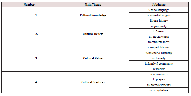 All the interviewees emphasized the significance of cultural knowledge, asserting that this formed the basis for maintaining an identity as Native American. “Our origins ancestrally must be known and be remembered” (P06). It is important that our history continue to be orally passed to future generations” (P10). Moreover, the participants emphasized the significance of knowing the tribal language, “who we truly are is steeped in the language” (P12). “Sometimes messages can be only communicated in our own tribal language and not in any other language as it does not translate” (P09). “Often, we make a fire and have our young sit with us as we share stories about how we were created and where we came from” (P03). Participants also highlighted how communication and sharing of their history happened orally. “We practice and use an oral tradition as a way to communicate with each other and pass along wisdom to our young” (P11). Three subthemes emerged from the theme of cultural knowledge: 1) tribal language, 2) ancestral origins, and 3) oral history.
