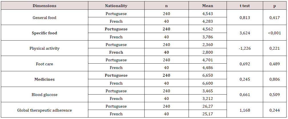 The study sample consist of 280 users with a clinical diagnosis of DM2, 240 participants (85.71%) are Portuguese and 40 (14.29%) are French. The analysis of the results in relation to adherence to the therapeutic regimen, according to nationality, showed that Portuguese users have an average overall adherence to the therapeutic regimen that is higher (26.27) compared to that observed in French users (25.17). The means of adherence to the therapeutic regimen obtained in this study are lower than those verified by Correia (2014), in which the mean value of adherence was 67.33, with women showing greater adherence [5]. Roo’s, Baptista and Miranda (2015) locked global adherence means were higher (44.94) than those observed in the study sample. In relation to general food, specific food, foot care, glycemic control, the Portuguese are also the ones with the highest averages [6]. Regarding nationality, and through the application of the t test for independent samples, the existence of statistically significant differences (p <0.001) between the groups in self-care related to specific food was only confirmed. Also, in the study by Roo’s, Baptista and Miranda (2015), higher means of adherence to selfcare, in general nutrition, specific nutrition, foot care, blood glucose control and medication intake were observed in relation to those observed in the sample of this study. In the practice of physical exercise showed adherence averages slightly higher than those observed in our study [6]. Carvalheiro (2003) states that Portugal is the country in Europe where the population least adheres to the practice of physical exercise [7]. The results obtained in our study also confirm that the French on average exercise more than the Portuguese. However, we emphasize that the practice of physical exercise of Portuguese participants is higher than the average found in the study by Correia (2014), which found a very low average of adherence [5]. Despite all the efforts made by the multidisciplinary team, it is still necessary to invest in the training of people with DM2, to increase adherence to the therapeutic regimen. The comparison of the means of adherence to the therapeutic regimen according to age group, in the global sample and according to nationality, it was found that both in the global sample and in the sample of Portuguese users, people under 65 years of age had means highest adhesion rates. Age can be a barrier to adherence to the treatment of a chronic disease, because, as age advances, it is common for people to have a reduced ability to understand information, such as also in physical mobility and capacity for self-care [8,9]. The comparison of average adherence to the therapeutic regimen according to marital status, for the overall sample, shows better levels of adherence in individuals who are married or in a de facto union. Different authors consider that the marital status can interfere with DM2and in your control, since, in some cases, the loss of a partner causes health changes such as depression, discouragement and loss of will to live [10]. WHO (2003) considers essential in the control of diabetes mellitus, training for adherence to treatment, especially in related to lifestyles [11]. This is a challenge that must be intensely faced in clinical practice by health professionals.
