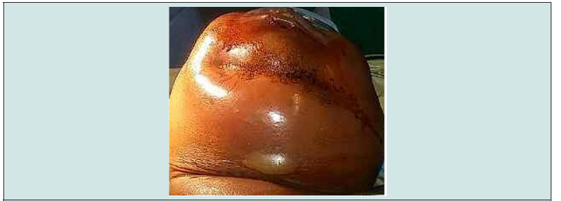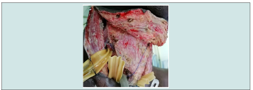 Treatment was probabilistic parenteral antibiotic therapy in all patients which was adjusted based on susceptibility testing. Surgical drainage was performed in patients with the collected form, i.e. 51 cases (80%). It consisted of a scalpel incision with evacuation and drainage of the pus. This surgery was performed under local anesthesia in 15 cases (29%) and under general anesthesia in 36 cases (71%), with debridement, excision of necrotic tissue and abundant washing with betadine, hydrogen peroxide and to the dakin with placement of Delbet- type drainage blades (Figure 2). After evacuation of the pus, surgical drainages and repeated lavages were performed. A minimal incision was performed in 38 patients (74.5%), an L or Paul-André incision in 3 patients (5.9%), the bimastoid incision was performed in 10 patients (19.6 %) and a thoracotomy in 1 patient. Treatment of the portal of entry was a dental avulsion by the stomatologist in 75%, a drainage of the phlegmon and a tonsillectomy. A tracheostomy in 6 cases (11.8%). The duration of the day in resuscitation was on average 7 days with an extreme of 1 to 25 days. Thirteen patients (20%) did not require surgical treatment. The evolution was favorable in 59 patients (92%) with complete healing, complications were noted in 3 cases such as delayed healing, osteitis of the mandible and bilateral pleurisy in one case each. We deplore the death that occurred in 2 cases (3%) following septic shock. The duration of hospitalization varied from 3 to 40 days with an average of 11.5 + or -7.8 days.