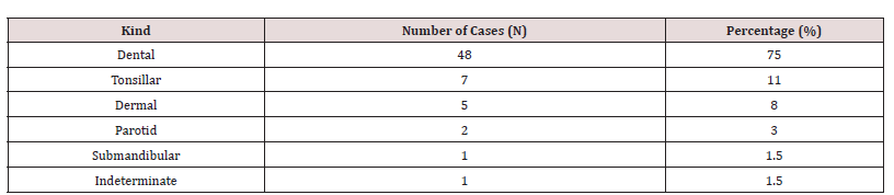 30 years and the extremes of 3 and 74 years. The portal of entry was dental in 75% of cases, tonsillar in 11% and skin in 8% of