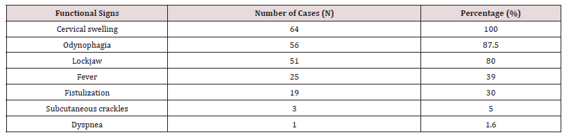 The average consultation time was 12 days with extremes of 2 to 60 days. The reason for consultation was swelling of the face and/or neck present in all patients. This was facial, cervical and cervico-facial in 20%, 28% and 52% of patients respectively (Figure 1). The symptoms and signs of these cellulitis are summarized in (Table 2). Cellulitis was circumscribed in 46 patients (72%) and diffuse in 18 patients (28%) including 3 with mediastinal involvement. They were collected in 51 patients (80%) and serous in 13 patients (20%). Bacteriologically, only 20 samples were analyzed and showed 10 sterile cases and 10 cases isolated a germ including streptococcus spp in 4 cases, Klebsiella pneumonia in 3 cases, Staphylococcus spp 2 cases and Enterobactercloacae in 1 case.